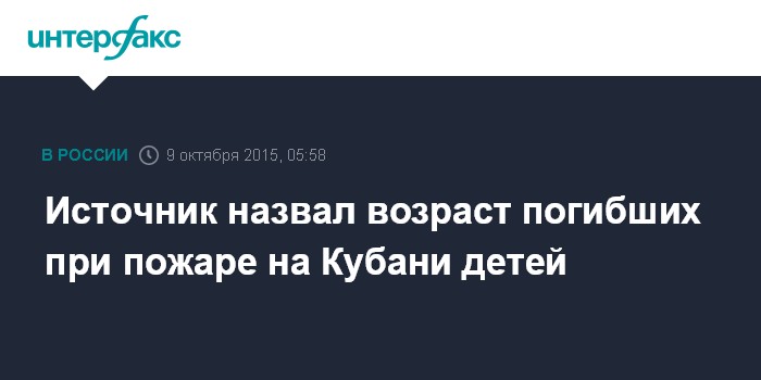 Москва. 9 октября. INTERFAX.RU - Возраст детей, погибших при пожаре в станице Холмская - от года до 10 лет, сообщили "Интерфаксу" в экстренных службах региона.