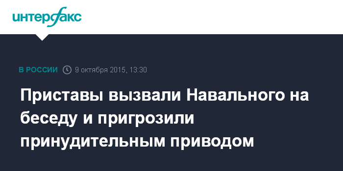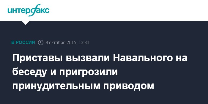 Москва. 9 октября. INTERFAX.RU - Московские судебные приставы официально вызвали на беседу оппозиционера Алексея Навального по делу о взыскании с него около 4,5 млн рублей, в случае неявки он будет доставлен принудительно, сообщил представитель столичного управления Федеральной службы служебных приставов (ФССП) Тимур Коробицын в пятницу "Интерфаксу".