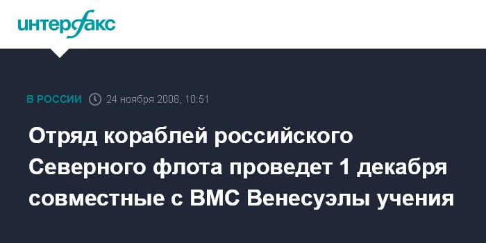Москва. 24 ноября. INTERFAX.RU - С 25 ноября по 1 декабря 2008 г. состоится визит отряда боевых кораблей Северного флота в порт Ла-Гуэйра (Венесуэла).