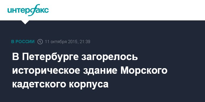 Москва. 11 октября. INTERFAX.RU - В историческом здании Морского кадетского корпуса в Петербурге начался пожар, сообщило городское ГУ МЧС в воскресенье.