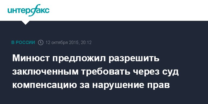 Москва. 12 октября. INTERFAX.RU - Министерство юстиции РФ приступило к разработке поправок в законодательство, которые позволят заключенным в колониях и следственных изоляторах требовать через суд денежную компенсацию за нарушение их прав в тюремных стенах.