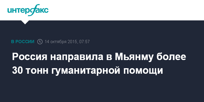 Москва. 14 октября. INTERFAX.RU - Самолет МЧС России доставил 30 тонн гуманитарной помощи для населения Мьянмы, пострадавшей от разрушительного наводнения.