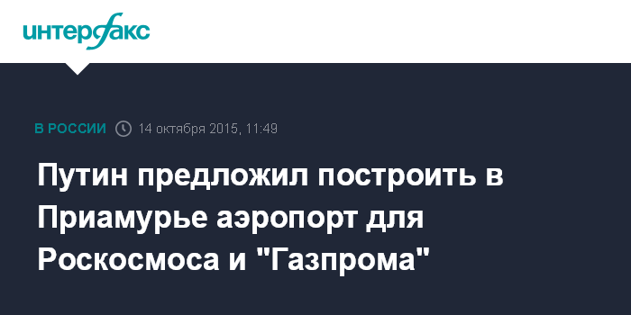 Москва. 14 октября. INTERFAX.RU - Президент России Владимир Путин поручил проработать вопрос строительства в Амурской области аэропорта, который мог бы использоваться для нужд космодрома Восточный.