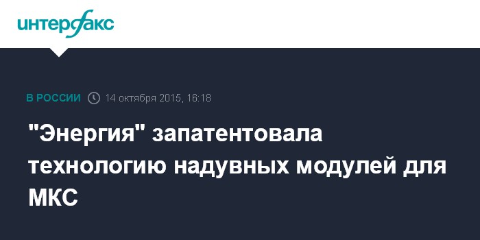 Москва. 14 октября. INTERFAX.RU - Ракетно-космическая корпорация (РКК) "Энергия" получила патент на изобретение надувного обитаемого модуля для российского сегмента Международной космической станции (МКС) и перспективных орбитальных станций, сообщила "Интерфаксу" в среду пресс-служба "Энергии".