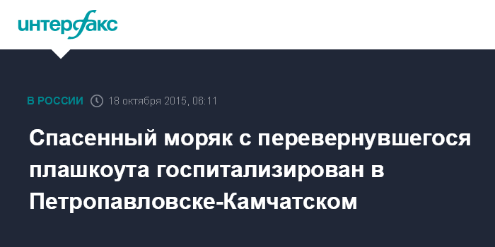 Москва. 18 октября. INTERFAX.RU - Спасенного члена экипажа перевернувшегося в районе курильского острова Шумшу судна "Парамушир" доставили в Петропавловск-Камчатский, сообщила "Интерфаксу" в воскресенье пресс-секретарь ГУ МЧС России по Камчатскому краю Юлия Ананьева.