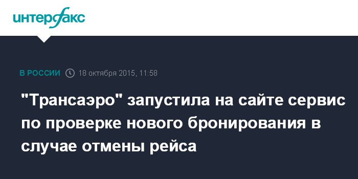 Москва. 18 октября. INTERFAX.RU - Авиакомпания "Трансаэро", которая отменяет каждый день определенное количество рейсов, запустила на своем сайте сервис по проверке нового бронирования в случае отмены рейсов.