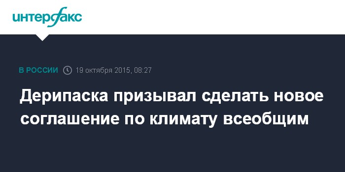 В интервью Financial Times он высказал мнение, что в нынешнем варианте проект соглашения, которое должно быть подписано на конференции в Париже, не предусматривает механизмов воздействия на нарушителей. Оно не остановит повышение температуры до потенциально опасного уровня, но при этом окажет негативное воздействие на конкурентоспособность бизнеса в странах, которые возьмут на себя более серьезные обязательства, опасается Дерипаска.