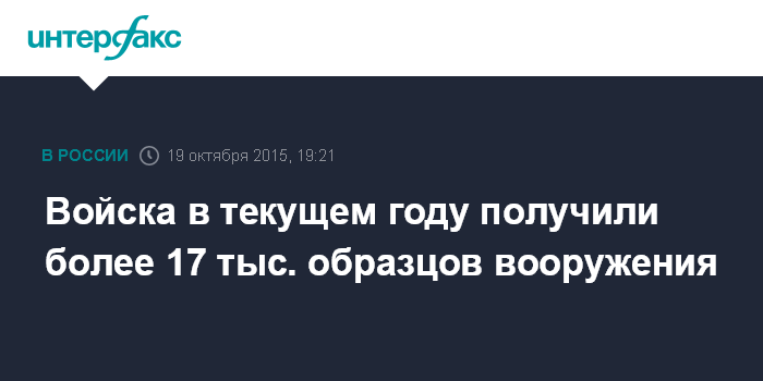 Москва. 19 октября. INTERFAX.RU - Более 17 тыс. образцов вооружения и военной техники поставлены в 2015 году в войска, заявил в понедельник начальник Национального центра управления обороной РФ генерал-лейтенант Михаил Мизинцев.