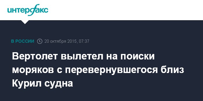 Москва. 20 октября. INTERFAX.RU - Вертолет Ми-8 одной из камчатских авиакомпаний вылетел для обследования района крушения судна "Парамушир", перевернувшегося близ курильского острова Шумшу, сообщает во вторник ГУ МЧС России по Камчатскому краю.