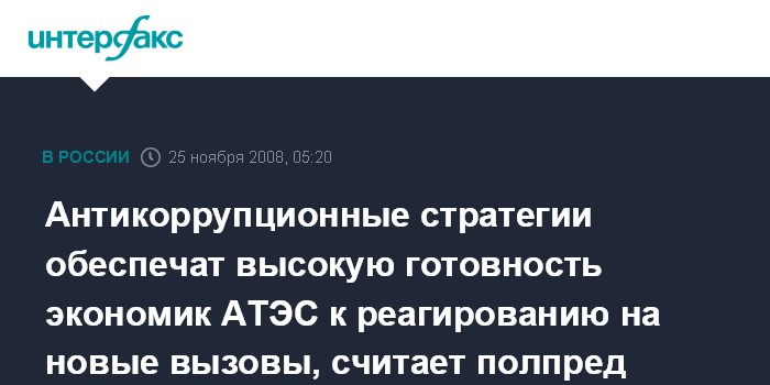 По словам полпреда, антикоррупционные стратегии обеспечат высокую готовность экономик АТЭС к реагированию на новые вызовы. "В принятой по итогам форума АТЭС декларации особое внимание было уделено вопросам борьбы с коррупцией в регионе",- добавил он.
