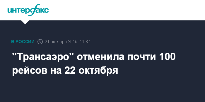 Москва. 21 октября. INTERFAX.RU - Авиакомпания "Трансаэро" отменяет 99 рейсов на 22 октября, говорится в сообщении "Аэрофлота".