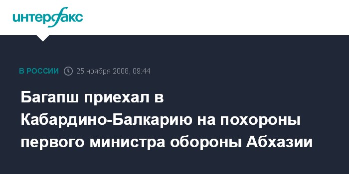 Москва. 25 ноября. INTERFAX.RU - Президент Абхазии Сергей Багапш прибыл во вторник в Кабардино-Балкарию. Как ожидается, Багапш будет присутствовать на похоронах первого министра обороны Абхазии Султана Сосналиева, который скончался на днях в Москве.