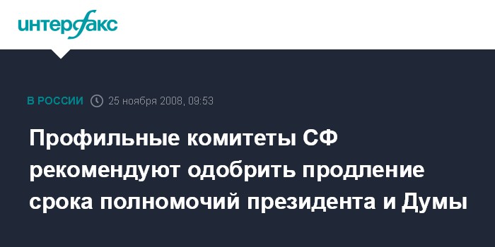 Москва. 25 ноября. INTERFAX.RU - Комитеты Совета Федерации по правовым и судебным вопросам и по конституционному законодательству рекомендуют верхней палате одобрить закон, касающийся внесения поправок в Конституцию РФ в части изменения срока полномочий президента и Госдумы, сообщил "Интерфаксу" глава комитета по правовым и судебным вопросам Анатолий Лысков.