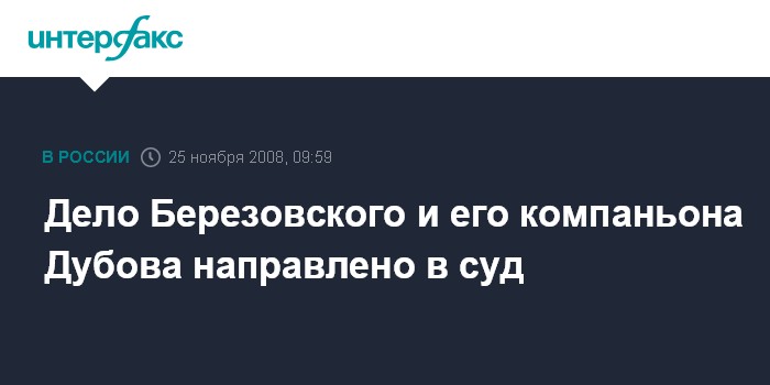 Москва. 25 ноября. INTERFAX.RU - Генеральная прокуратура России направила в суд уголовное дело в отношении предпринимателей Бориса Березовского и его компаньона Юлия Дубова.