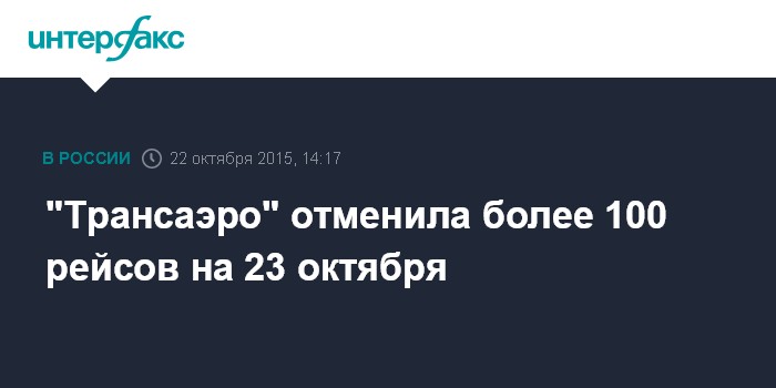 Москва. 22 октября. INTERFAX.RU - Авиакомпания "Трансаэро" отменяет 114 рейсов на 23 октября, говорится в сообщении "Аэрофлота".