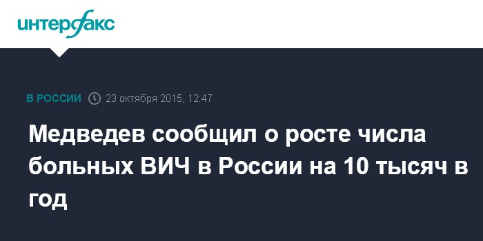 Москва. 23 октября. INTERFAX.RU - Число ВИЧ-инфицированных растет в среднем на 10% ежегодно, сообщил премьер РФ Дмитрий Медведев.