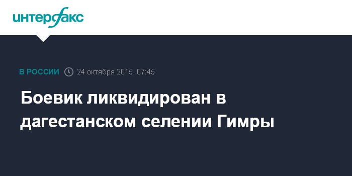 Москва. 24 октября. INTERFAX.RU - Сотрудники федеральных сил, по предварительным данным, ликвидировали одного участника бандподполья в ходе контртеррористической операции (КТО) в селении Гимры Унцукульского района Дагестана, сообщили "Интерфаксу" в силовых структурах региона.