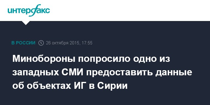 Москва. 26 октября. INTERFAX.RU - Министерство обороны России просит шефа московского бюро одного из западных СМИ предоставить имеющиеся у них материалы с точным расположением объектов, находящихся под контролем ИГ в Сирии, которыми издание располагает, судя по их обращениям в военное ведомство.