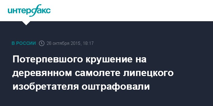 Москва. 26 октября. INTERFAX.RU - Житель липецкой области, создавший своими руками самолет и потерпевший на нем крушение в сентябре этого года, оштрафован за нарушение правил воздушного сообщения.