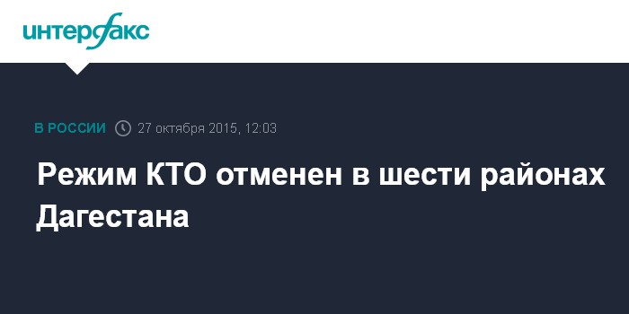 Москва. 27 октября. INTERFAX.RU - Режим контртеррористической операции отменен во вторник в шести районах Южного Дагестана, сообщили агентству "Интерфакс" в Оперативном штабе республики.