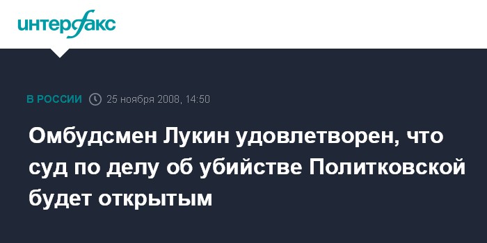 Москва. 25 ноября. INTERFAX.RU - Уполномоченный по правам человека в РФ Владимир Лукин удовлетворен тем, что суд принял решение сделать открытым процесс по делу об убийстве журналистки Анны Политковской.