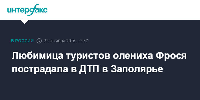 Москва. 27 октября. INTERFAX.RU - Домашняя самка оленя по имени Фрося, ставшая популярной среди туристов и местных жителей, пострадала в результате ДТП в Печенгском районе Мурманской области, сообщили "Интерфаксу" сотрудники приграничной гостиницы.