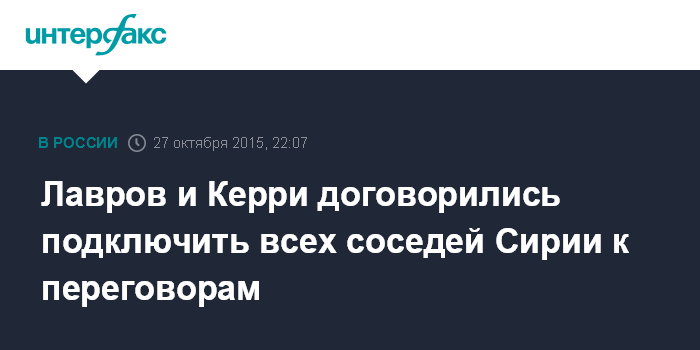 Москва. 27 октября. INTERFAX.RU - Глава МИД РФ Сергей Лавров и госсекретарь США Джон Керри в ходе телефонного разговора во вторник констатировали согласие о необходимости подключения к урегулированию в Сирии всех основных государств региона, сообщает сайт министерства иностранных дел России.