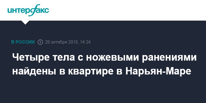 Москва. 28 октября. INTERFAX.RU - Управление СКР по Ненецкому автономному округу возбудило дело в связи с обнаружением тел четырех убитых в квартире в Нарьян-Маре, сообщила пресс-служба ведомства в среду.