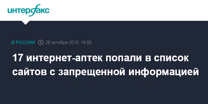 Москва. 28 октября. INTERFAX.RU - Роскомнадзор внес в единый реестр сайтов с запрещенной информацией 17 интернет-аптек, которые незаконно продавали лекарственные препараты.