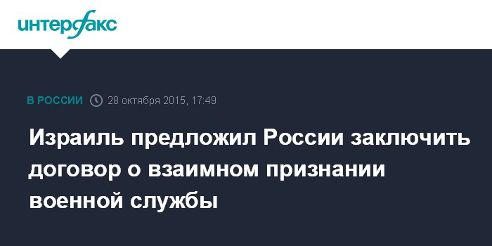 Москва. 28 октября. INTERFAX.RU - Израиль предложил России заключить межправительственное соглашение о взаимном признании военной службы, сообщают в Минэкономразвития. Об этом сообщила замглавы департамента Азии, Африки и Латинской Америки Минэкономразвития РФ Наиля Черникова на заседании российско-израильской межправкомиссии.