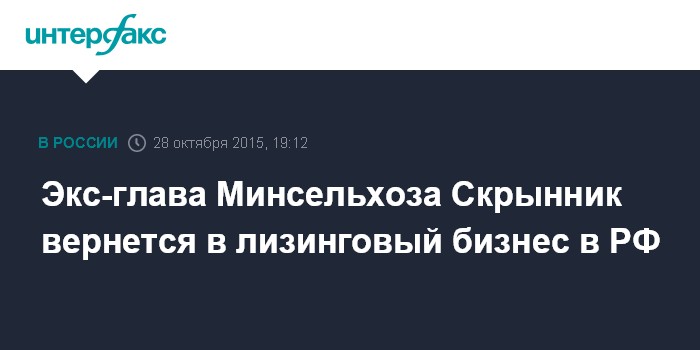 Москва. 28 октября. INTERFAX.RU - Бывший министр сельского хозяйства РФ Елена Скрынник может вернуться в лизинговый бизнес в РФ.