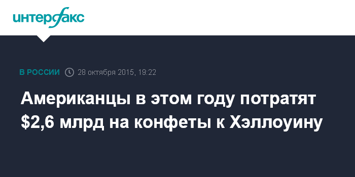Как прогнозирует Национальная ассоциация кондитеров (NCA), в этом году на покупку конфет к 31 октября будет потрачено $2,6 млрд против немногим более $2,5 млрд годом ранее. Эта сумма составляет более 7% годовых продаж в отрасли.