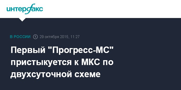 Москва. 29 октября. INTERFAX.RU - Стыковка первого космического грузового корабля новой серии "Прогресс-МС" пройдет по двухсуточной схеме, заявил "Интерфаксу" источник в ракетно-космической отрасли.