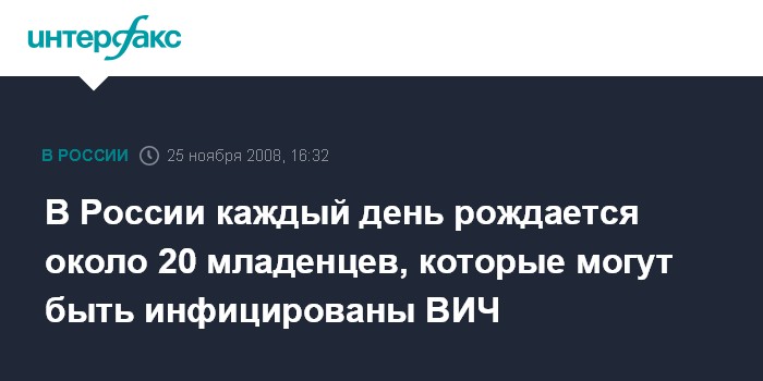 Москва. 25 ноября. INTERFAX.RU - В России каждый год от матерей, инфицированных вирусом иммунодефицита человека, рождается около 8 тысяч младенцев, сообщают в Роспотребнадзоре.
