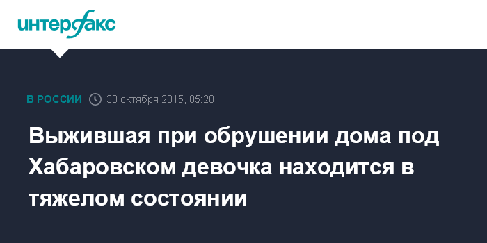 Москва. 30 октября. INTERFAX.RU - Состояние спасенной девочки, которую достали из-под завалов дома в поселке Корфовский под Хабаровском, пока тяжелое, сообщил журналистам заместитель председателя правительства Хабаровского края Анатолий Литвинчук.