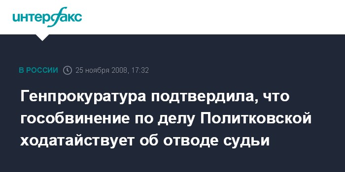 Москва. 25 ноября. INTERFAX.RU - В Генеральной прокуратуре России подтвердили факт ходатайства об отводе судьи со стороны гособвинителя по делу об убийстве журналистки Анны Политковской.