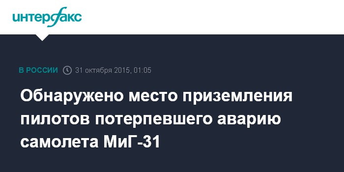 Москва. 31 октября. INTERFAX.RU - Экипаж самолета Ил-38 в ходе поисково-спасательной операции по работающему аварийному радиомаяку обнаружил место приземления обоих пилотов потерпевшего аварию самолета МиГ-31, сообщили "Интерфаксу" в управление пресс-службы и информации Минобороны РФ.