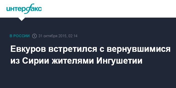 Москва. 31 октября. INTERFAX.RU - Глава Ингушетии Юнус-Бек Евкуров в Магасе встретился с местными жителями, которые вернулись из Сирии, побывав на стороне повстанцев, воющих против правительственных войск, сообщили "Интерфаксу" в пресс-службе главы региона.