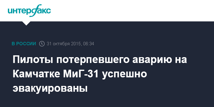 Москва. 31 октября. INTERFAX.RU - Оба пилота потерпевшего аварию в Камчатском крае истребителя МиГ-31 успешно эвакуированы на аэродром Елизово, сообщает управление пресс-службы и информации министерства обороны РФ.