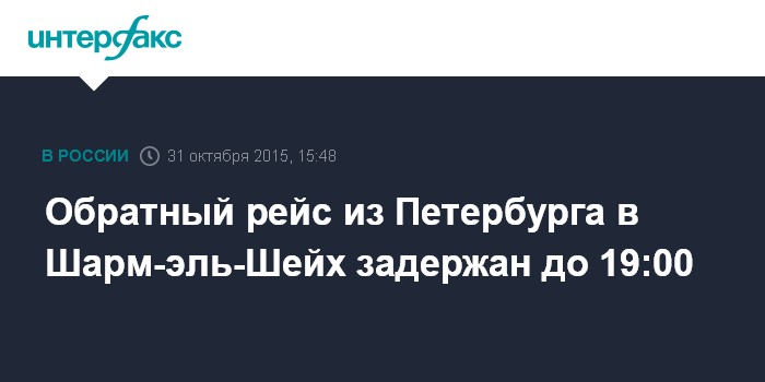 Москва. 31 октября. INTERFAX.RU - Рейс из Санкт-Петербурга в Шарм-эль-Шейх (Египет), который должен был выполнять борт 7К-9267, разбившийся в Египте, отложен с 13:40 мск до 19:00 мск, передал корреспондент "Интерфакса".