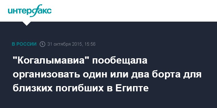 Москва. 31 октября. INTERFAX.RU - "Когалымавиа" организует один или два рейса для родственников погибших в авиакатастрофе в Египте. Кроме того, на место трагедии бортом МЧС вылетят два сотрудника авиакомпании, сообщила представитель холдинга TH&C (в его состав входит перевозчик) Оксана Головина на пресс-конференции в субботу в Москве.