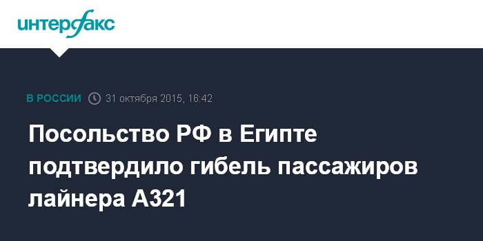 Москва. 31 октября. INTERFAX.RU - Посольство России в Египте официально подтвердило, что выживших в авиакатастрофе самолета "Когалымавиа" нет.