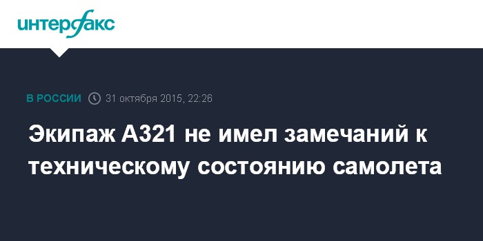Москва. 31 октября. INTERFAX.RU - Экипаж самолета А321 перед вылетом из аэропорта Курумоч (Самара) в Шарм-эль-Шейх не жаловался на состояние судна.
