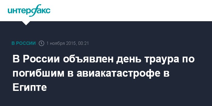 Москва. 1 ноября. INTERFAX.RU - В России первого ноября в связи с авиакатастрофой пассажирского самолета "Когалымавиа", рухнувшего накануне на Синае, объявлен траур, будут приспущены государственные флаги и отменены развлекательные передачи и мероприятия.