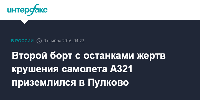Москва. 3 ноября. INTERFAX.RU - Спецрейс с останками жертв авиакатастрофы в Египте совершил посадку в аэропорту "Пулково", передает корреспондент "Интерфакса" во вторник. Самолет приземлился около 04:16 мск