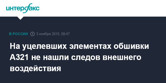 Москва. 3 ноября. INTERFAX.RU - На уцелевших фрагментах обшивки разбившегося на Синайском полуострове А321 отсутствуют следы внешнего воздействия, сообщил во вторник "Интерфаксу" информированный источник в Каире.