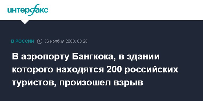Москва. 26 ноября. INTERFAX.RU - В Таиланде в здании главного аэропорта Бангкока, заблокированном тайской оппозицией, произошел взрыв, ранены три человека. В здании находятся около трех тысяч человек, в том числе 200 российских туристов, сообщает телеканал "Вести-24".