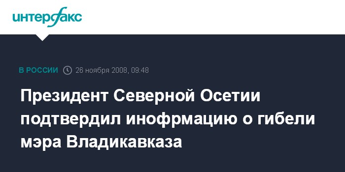 Москва. 26 ноября. INTERFAX.RU - Президент Северной Осетии Таймураз Мамсуров подтверждает гибель мэра Владикавказа Виталия Караева, на которого утром в среду было совершено покушение.
