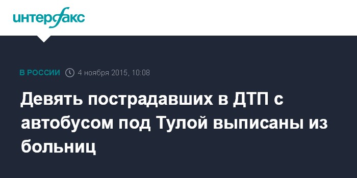 Москва. 4 ноября. INTERFAX.RU - Из медучреждений Тульской области выписаны девять человек, пострадавших в результате аварии с автобусом в Узловском районе, еще двое переведены из реанимации в палаты, сообщила заместитель председателя областного правительства Марина Левина на оперативном совещании в правительстве Тульской области в среду.