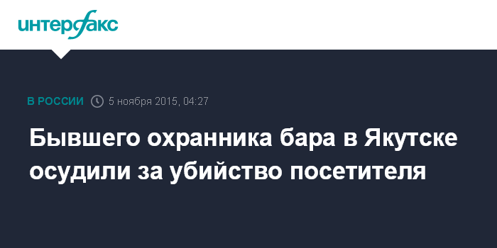 Москва. 5 ноября. INTERFAX.RU - Якутский городской суд приговорил к лишению свободы бывшего охранника ночного бара, обвиняемого в убийстве посетителя, сообщает в четверг пресс-служба прокуратуры по региону.